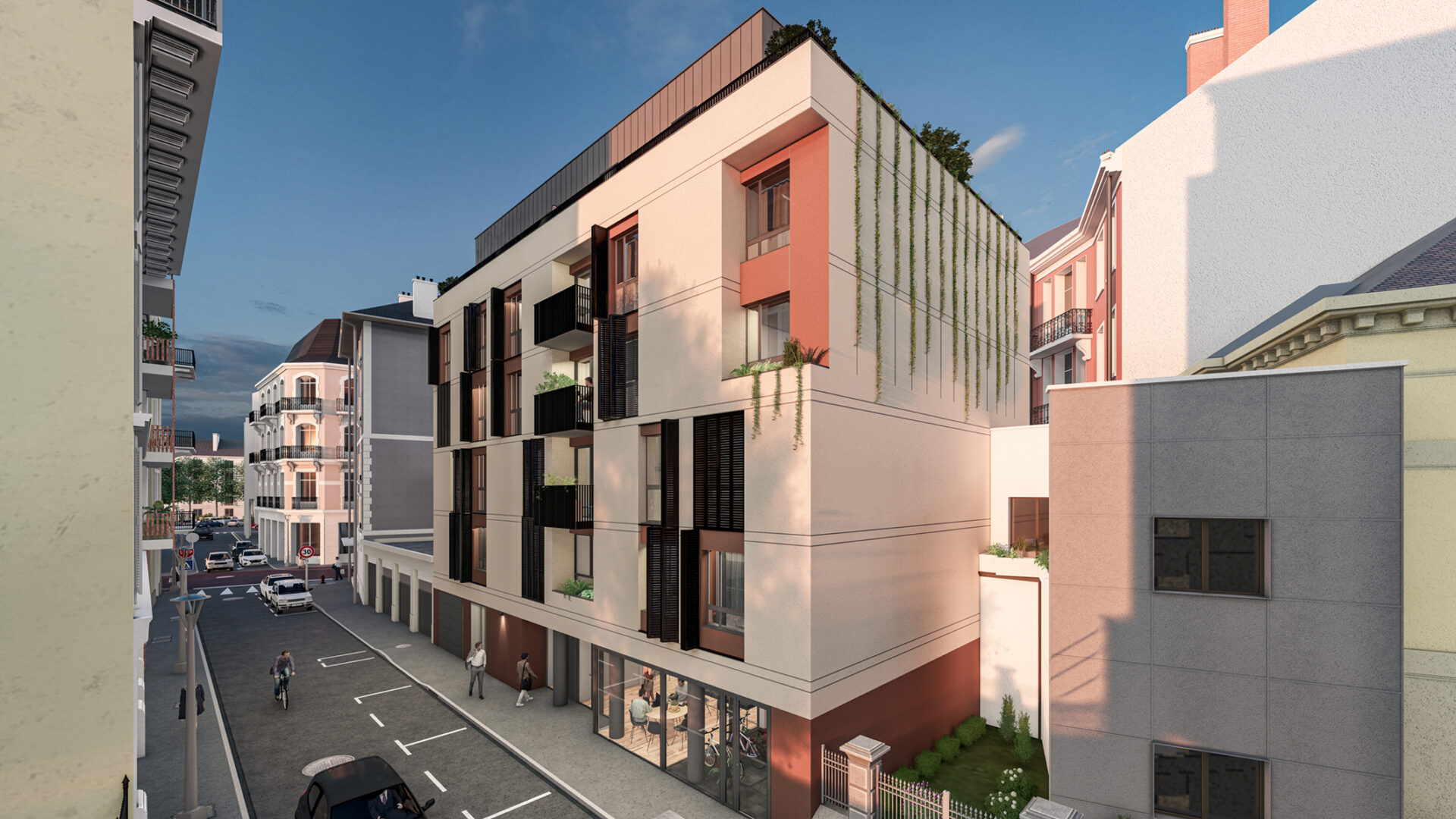 La résidence offre une façade principale sur rue avec un ordonnancement contemporain qui s’exprime par le décalage de ses ouvertures : deux creux verticaux viennent ponctuer cette façade et former des jardinières au premier et au troisième étage. Ces 2 creux permettent de réduire l’échelle du bâtiment vis-à-vis de la rue et du cadre bâti environnant. Des persiennes pliables (dispositif que l’on retrouve souvent dans le quartier) sont utilisées pour animer la façade en créant un jeu d’ombre aléatoire et évolutif en fonction des horaires et des saisons. Les allèges pleines ou vitrées en verre sérigraphié assurent l’intimité des résidents, et les ouvertures sont généreuses pour offrir un maximum de lumière côté rue et de la transparence vers le cœur d’ilot. Le RDC est très ouvert sur ses 2 façades principales et offre des vues traversantes sur le jardin intérieur : l’espace commun du RDC participe ainsi à l’animation de la rue. Les façades pignons latérales, en partie végétalisées, sont tramées et la façade nord-est est agrémentée d’ouvertures pour offrir de la lumière naturelle aux circulations communes sur tous les niveaux.