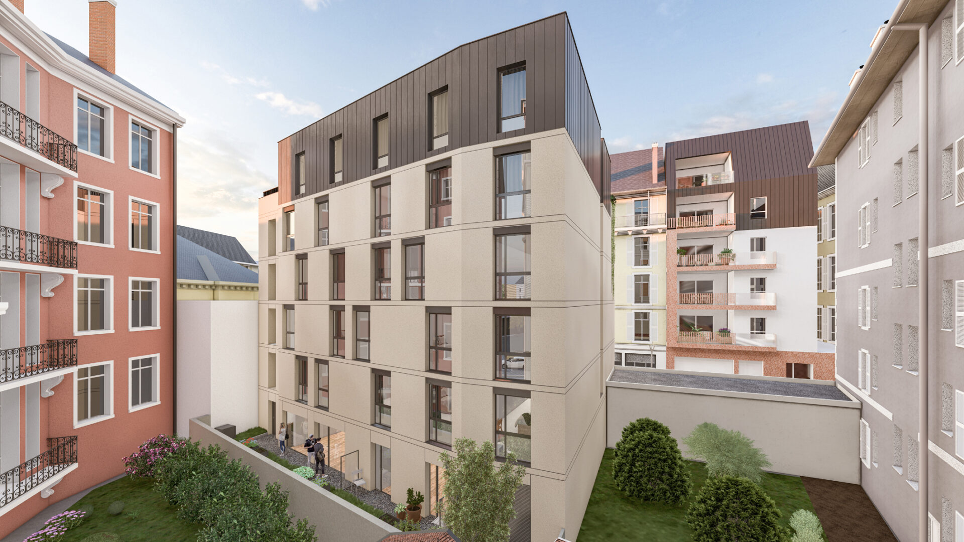Cette construction s’inscrit dans un volume simple qui est en cohérence avec les constructions voisines. La lecture d’une toiture pour le N5 (en léger retrait de la façade principale, et avec un revêtement qualitatif) adoucie la hauteur totale en R+5 (qui est bien inférieure à la hauteur totale maximale autorisée initialement par le règlement). L’objectif était de proposer un gabarit urbain et une architecture qui soient en lien avec les nouveaux projets réalisés ou en travaux dans le secteur. La hauteur importante du RDC permet d’offrir des volumes généreux aux espaces communs de la future résidence tout en soulignant l’importance de la ligne piétonne. L’implantation du bâtiment sur ses limites latérales permet de refermer et redessiner l’îlot.